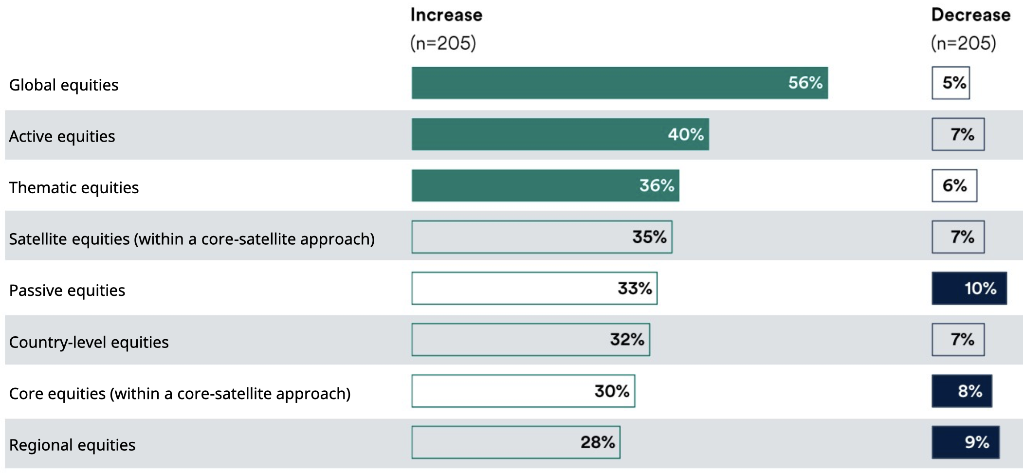 Più della metà delle Compagnie assicurative intervistate prevede di aumentare le proprie allocazioni in mandati azionari globali entro i prossimi due anni, con una maggiore esposizione alla gestione attiva, oltre a un accresciuto interesse per i temi della deglobalizzazione e delle tecnologie disruptive. Questa tendenza è comune a tutti i tipi di Compagnie intervistate: Vita, Danni, composite e riassicurazione. Ciò conferma linteresse che riscontriamo da parte dei nostri clienti e la convinzione che le attuali dinamiche di mercato, tra cui il dominio delle azioni statunitensi, possano essere sfruttate in modo più efficace tramite soluzioni globali gestite con approccio attivo. Ciò riduce la necessità per i comitati d'investimento di occuparsi delle variazioni delle allocazioni regionali e nazionali, consentendo un efficientamento della governance.