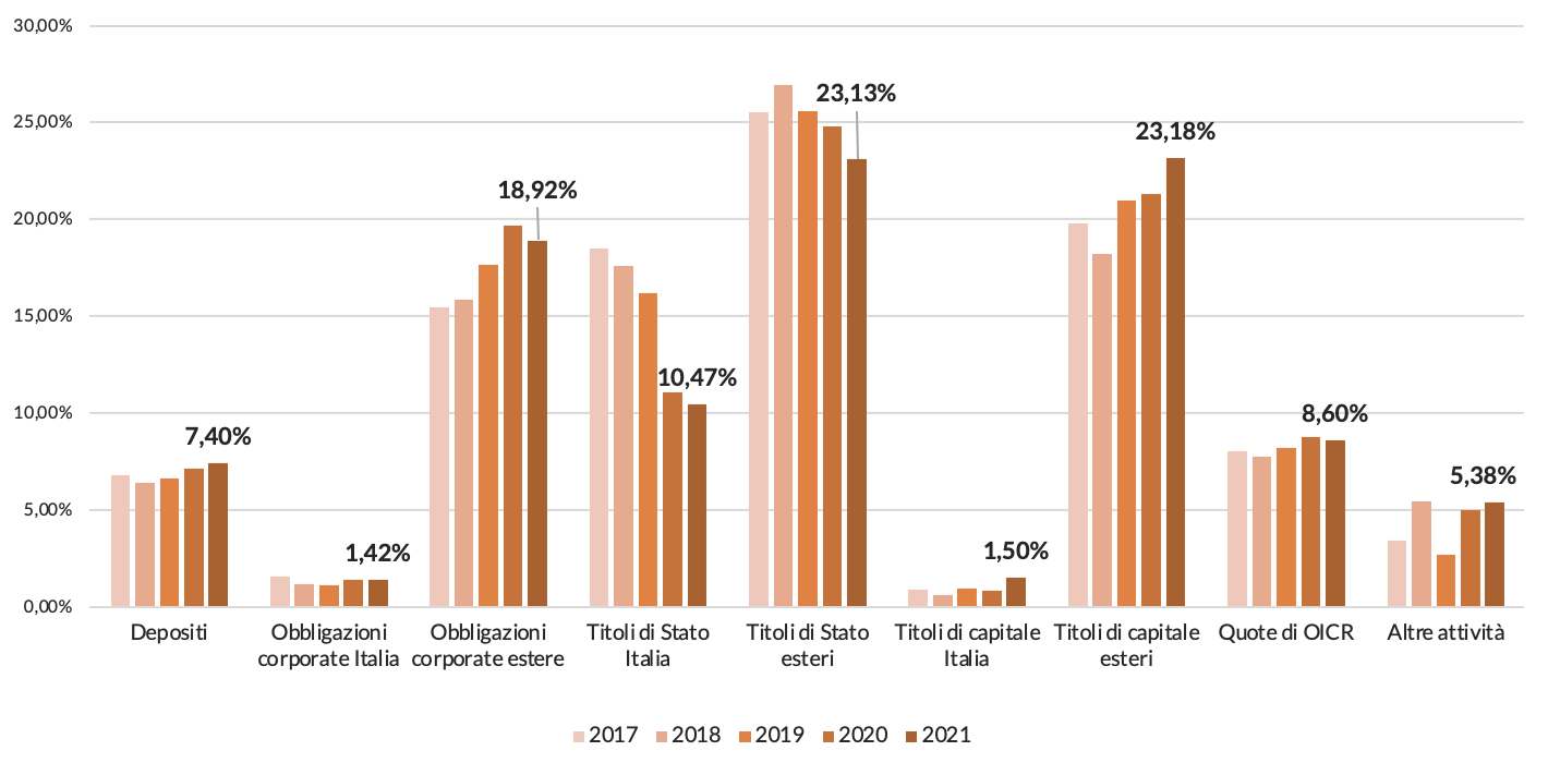 In linea con le disposizioni di legge, la gestione è quasi totalmente esternalizzata a soggetti professionali come banche, SIM, SGR e Compagnie di Assicurazione. Tuttavia, in questi ultimi anni un numero crescente di fondi ha implementato la gestione diretta, tramite sottoscrizione di quote di fondi comuni di investimento, per un ammontare pari a circa 300 milioni di euro e un peso sul totale dellattivo netto destinato alle prestazioni pari allo 0,5%. Si tratta principalmente di fondi alternativi: il settore delle infrastrutture rappresenta oltre il 40% dellesposizione complessiva, seguito dal private debt (circa il 30%), dal private equity (22%) e dal social housing (circa il 3%). Tra i fondi di private debt e private equity rientrano i fondi di fondi gestiti da Fondo Italiano dInvestimento SGR nellambito del Progetto Economia Reale, liniziativa promossa da Assofondipensione e Cassa Depositi e Prestiti, che nel corso del 2021 ha raccolto sottoscrizioni da parte di dieci fondi pensione negoziali per un commitment complessivo di circa 182 milioni di euro.