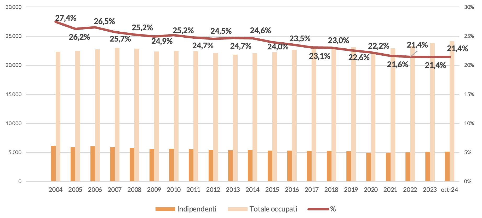Un settore che ha conosciuto un rapido declino a partire dagli anni Duemila, con una riduzione in valore assoluto di oltre 1 milione di unità, per poi cominciare un faticoso recupero negli ultimi anni. In particolare, dal picco di 6,3 milioni di addetti toccati a inizio 2004, il numero di lavoratori indipendenti è progressivamente diminuito fino a un minimo di 4,86 milioni (-23,1%) nel febbraio 2021 anche a causa degli effetti della pandemia (-350mila lavoratori rispetto a inizio 2020). Da allora, il numero di lavoratori indipendenti è lentamente risalito fino a 5,16 milioni a ottobre 2024, rimanendo però ancora leggermente al di sotto dei livelli pre COVID (5,2 milioni a dicembre 2019).