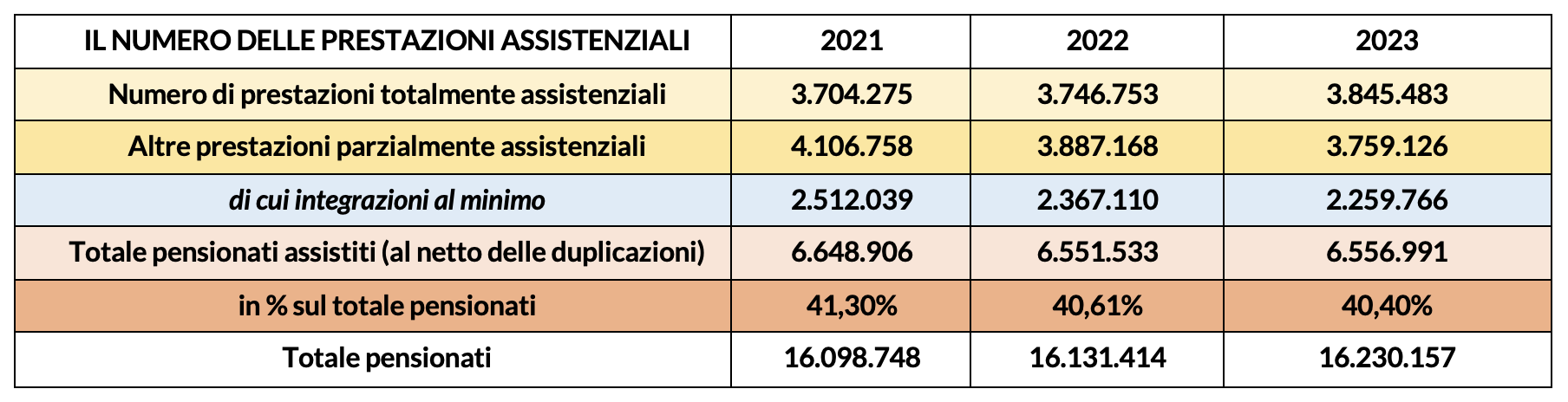 Al 2023 risultano in pagamento 3.845.483 trattamenti di natura interamente assistenziale (invalidità civile, indennità di accompagnamento, assegni sociali, pensioni di guerra) per un costo totale annuo di 23,013 miliardi, in costante aumento malgrado il calo fisiologico e costante delle pensioni di guerra. Nello stesso anno, sono state poi erogate altre 3.759.126 prestazioni parzialmente assistenziali (maggiorazioni sociali, integrazioni al minimo, importo aggiuntivo), di cui 2.259.766 integrazioni al trattamento minimo. Tenendo conto che uno stesso soggetto può essere titolare di più prestazioni, al netto delle duplicazioni e non considerando la quattordicesima mensilità, i pensionati totalmente o parzialmente assistiti sono dunque 6.556.991, vale a dire il 40,40% del totale.