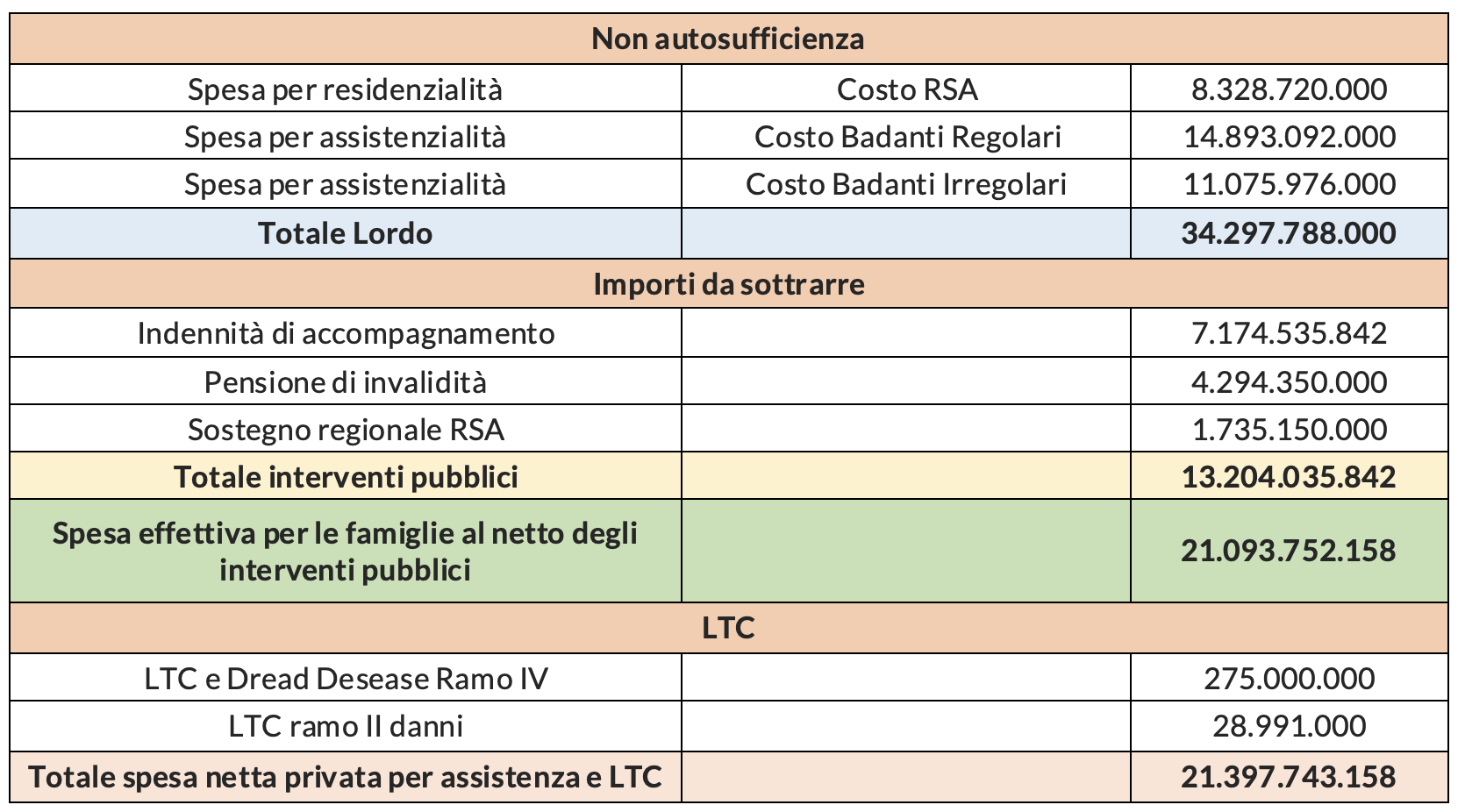 Tornando al welfare privato nel suo complesso, subito dopo la spesa per la sanità, si evidenziano gli oltre 34 miliardi destinati alla gestione della non autosufficienza, intesa come costi sostenuti dai singoli e dalle famiglie per residenzialità (RSA e altro) e per assistenza domiciliare (badanti), oltre al totale premi per polizze assicurative LTC; al netto dei trasferimenti pubblici per indennità di accompagnamento e sostegno alla residenzialità di cui beneficiano i fruitori di queste prestazioni, la spesa è pari a 21,398 miliardi di euro, di cui 275 milioni derivanti dalla raccolta premi per LTC e Dread Desease di ramo IV e altri 29 circa imputabili alla componente LTC di ramo II. Un valore, quello della spesa per non autosufficienza, complesso da stimare con precisione e verosimilmente sottostimato sia perché non esistono dati ufficiali circa la spesa privata sostenuta dalle famiglie per i ricoveri nella RSA (si è pertanto considerata una media di circa 2.000 euro al mese per i 347mila non autosufficienti italiani ospitati presso strutture residenziali) sia per la difficoltà di quantificare limporto delle spese a domicilio tra attrezzature abitative comprate dai singoli e oneri destinati a eventuali badanti e caregiver professionali che, non di rado, prestano servizio senza contratti regolari. Circa 461mila quelli stimati dagli estensori dal Rapporto, contro i 413.697 badanti regolari calcolati da Istat, per un costo medio di circa 24mila euro lanno.