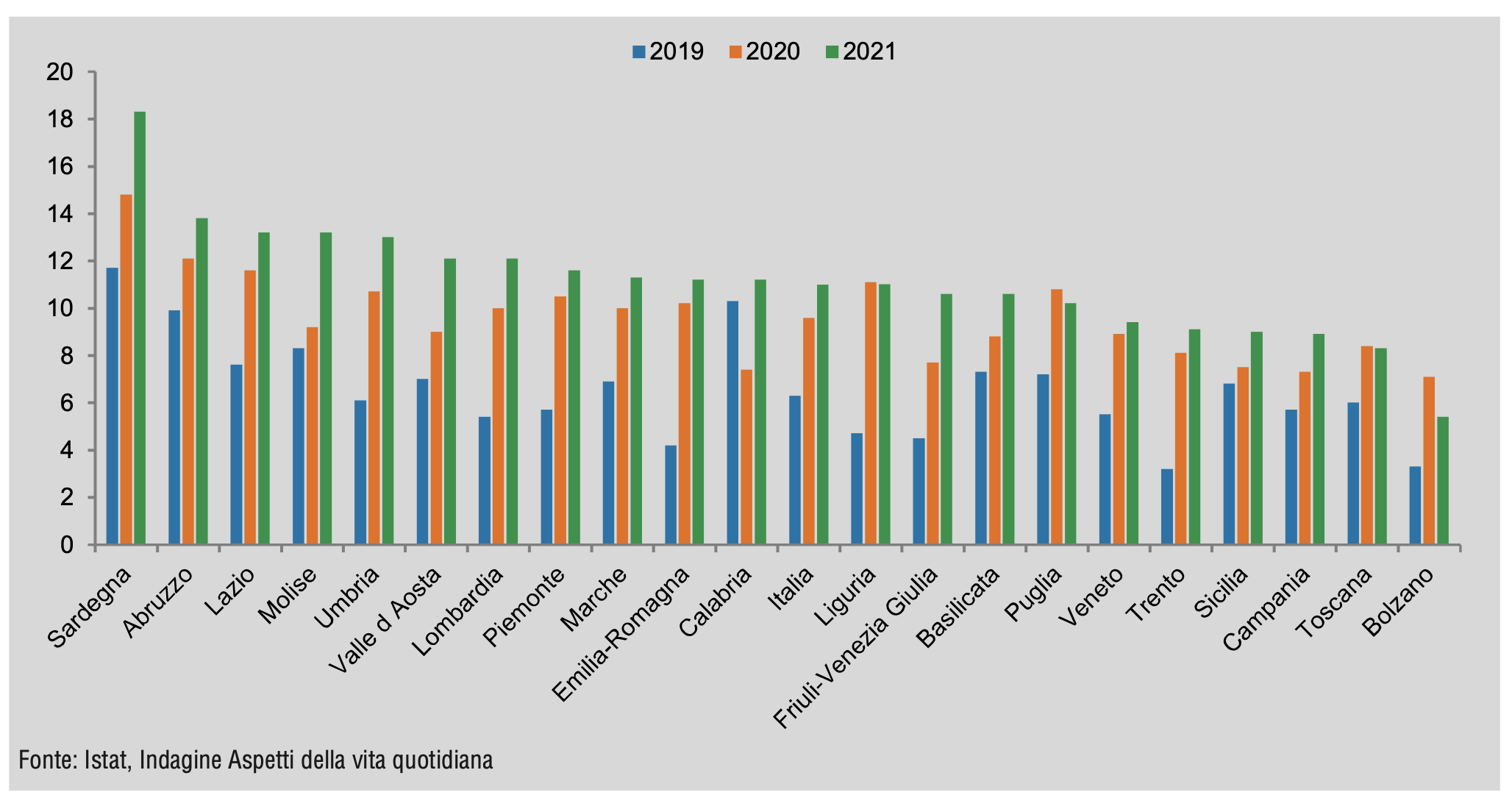 Inoltre, dalla figura 1 si evince chiaramente come le differenze territoriali presenti sino al 2019, che vedevano le Regioni del Mezzogiorno con valori percentuali significativamente più grandi rispetto a quelle del Nord e del Centro, sono state significativamente appianate dalla pandemia rendendo il problema omogeneo a livello nazionale. Persistono comunque alcune situazioni di forte criticità: in Sardegna quasi una persona su cinque che aveva necessità di effettuare una prestazione sanitaria ha rinunciato; in Abruzzo la percentuale è pari al 13,8%, mentre nel Molise e nel Lazio è del 13,2%.